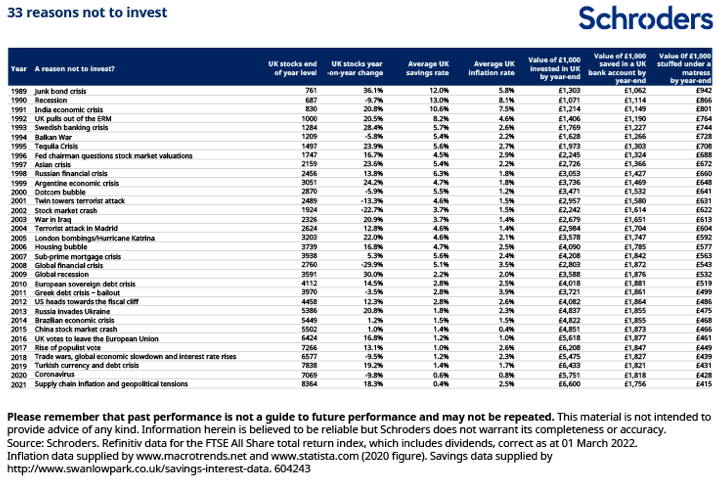 De afgelopen vier decennia zijn er tal van schokken op de aandelenmarkten geweest die mensen ervan kunnen weerhouden om te beleggen. Schroders heeft onderzocht wat er is gebeurd na zulke schokgolven. Volgens Nick Kirrage, fondsbeheerder bij Schroders, bestaat er geen perfect instapmoment, maar tonen onderzoeksgegevens wel aan dat beleggen op de lange termijn meer oplevert dan sparen.