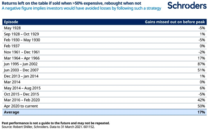 Is deze hoge waardering een verkoopadvies? Dat is aan de belegger. Maar het is ongekend moeilijk gebleken om een marktpiek te herkennen. Onderzoek van Schroders toont aan dat het volledig uit aandelen stappen op basis van intimiderend hoge waarderingen in het verleden een verliesstrategie is gebleken. Het is mogelijk om de blootstelling te temperen, maar drastische maatregelen kunnen ook drastische gevolgen hebben.