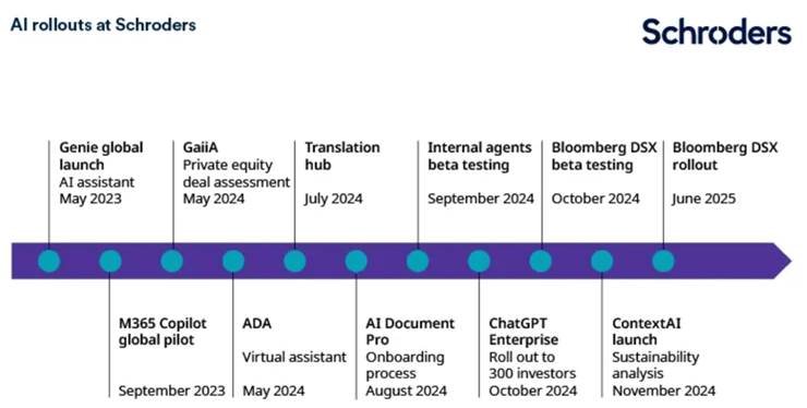 Inmiddels maken bijna 300 analisten en beleggers bij Schroders in de publieke-markten-divisie gebruik van ChatGPT Enterprise en Contex AI. Ook Bloomberg DSX wordt nu breed uitgerold. Waar 2024 nog draaide om introductie en gewenning, moet 2025 het jaar worden waarin AI volledig is geïntegreerd in de dagelijkse praktijk.