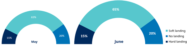 We blijven een zachte landing als meest waarschijnlijke uitkomst zien (65%), met een lichte voorkeur voor geen landing (20%) – waarbij de Amerikaanse Federal Reserve (Fed) in 2025 niet bereid of in staat is om de rente te verlagen – ten opzichte van het risico van een harde landing.