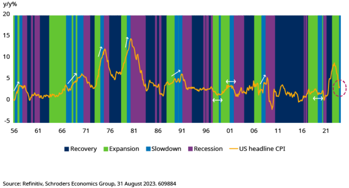 In het verleden steeg en piekte de inflatie meestal tijdens economische vertragingen, omdat de verkrapping van het monetaire beleid door de centrale bank uiteindelijk de groei vertraagde, waardoor de werkloosheid steeg en de outputgap kromp. Maar bij het ingaan van deze vertragingsfase ervaren we een andere inflatiedynamiek dan in eerdere economische cycli, aangezien de inflatie dit keer daalt (gemarkeerd door de cirkel in grafiek afbeelding hieronder).