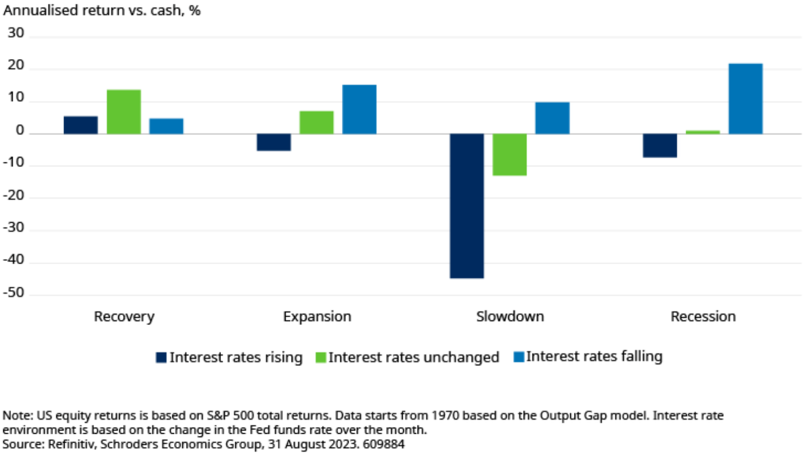 Het gemiddelde rendement van de S&P 500 is over het algemeen positiever als de rente is gedaald. De verkrapping van het monetaire beleid, vooral tijdens de vertragingsfase, was daarentegen een slechte omgeving voor aandelen. Dat gezegd hebbende, heeft de rente meestal zijn piek bereikt tijdens vertragingen en verlaagt de Fed de rente of laat hem ongewijzigd.