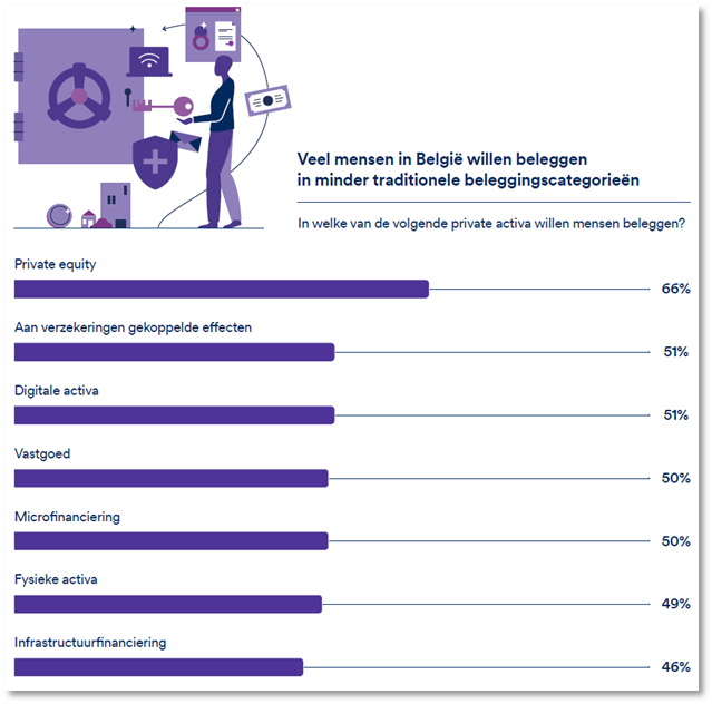 Volgens het onderzoek hebben mensen nu meer vertrouwen in beleggingen die vroeger eerder als buiten hun bereik werden beschouwd. Een bijzonder voorbeeld hiervan is private activa. 47% van de Belgische beleggers vindt dat ze toegang moeten krijgen tot zowel private equity als fysieke activa.
