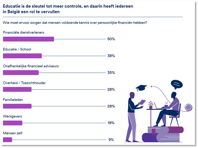 Dit onderstreept de noodzaak van een betere financiële educatie en de rol die financiële instellingen moeten spelen. De helft van de Belgische mensen (50%) vindt dat beleggingsmaatschappijen er verantwoordelijk voor moeten zijn dat mensen voldoende kennis hebben over persoonlijke financiële zaken, en 35% vindt dat het de verantwoordelijkheid van financieel adviseurs moet zijn.