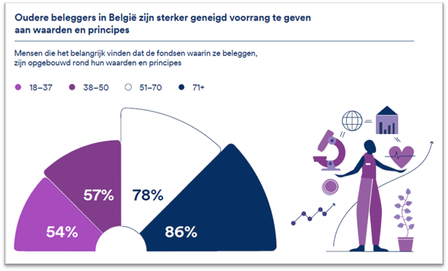 Bovendien neemt het belang dat beleggers hechten aan waarden en principes in de leeftijd toe, waarbij meer dan vier vijfde (86%) van de mensen in de leeftijd van 71+ meer geneigd is prioriteit te geven aan deze aspecten, wat wellicht aangeeft dat oudere beleggers meer vertrouwen hebben in hun visie.