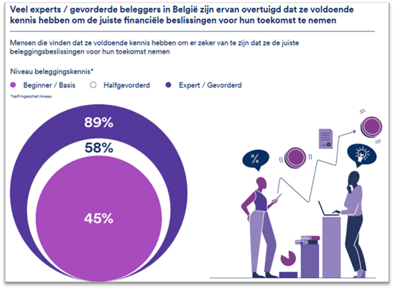 Ondanks de positieve intenties blijft er echter een kloof bestaan voor wat betreft beleggers die zich werkelijk in staat voelen om de juiste beleggingsbeslissingen te nemen voor hun toekomst. Zo'n 89% van de Belgische “expert/geavanceerde” beleggers vindt dat ze over voldoende kennis beschikken om vertrouwen te hebben in het nemen van beleggingsbeslissingen voor hun financiële toekomst, terwijl bijna de helft (45%) van de Belgische “beginnende/rudimentaire” beleggers zich goed genoeg voelt om dat te doen.