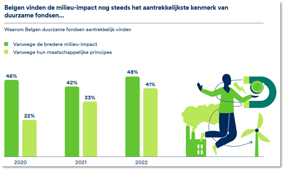 Sommige Belgische mensen aarzelen echter nog steeds om te investeren in duurzame fondsen. Waarom? Voor 52% ligt dat aan te weinig transparantie en gerapporteerde gegevens van aanbieders over de impact van duurzame beleggingen. Volgens 44% komt dat door het ontbreken van een duidelijke, algemene definitie van wat duurzaam beleggen inhoudt. En 25% is bezorgd om het rendement.