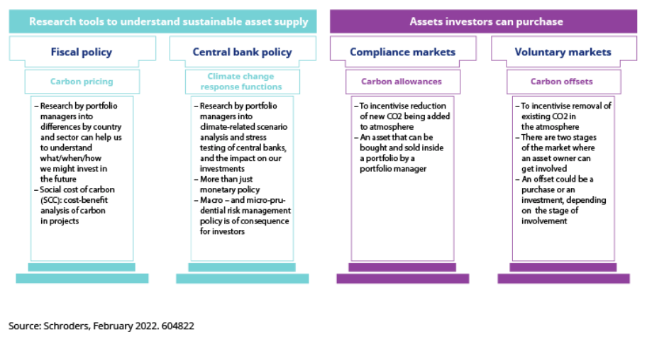 De andere twee pijlers van het raamwerk vertegenwoordigen CO2-gerelateerde activa die beleggers concreet kunnen kopen en verkopen. De twee soorten verhandelbare markten - gereguleerde en vrijwillige - zijn vanuit het oogpunt van de belegger zeer verschillend. Schroders meent dat er zowel een beleggings- als een duurzaamheidsmotief is voor het gebruik van CO2-emissierechten, waardoor ze geschikt zijn voor gebruik binnen een portefeuille.