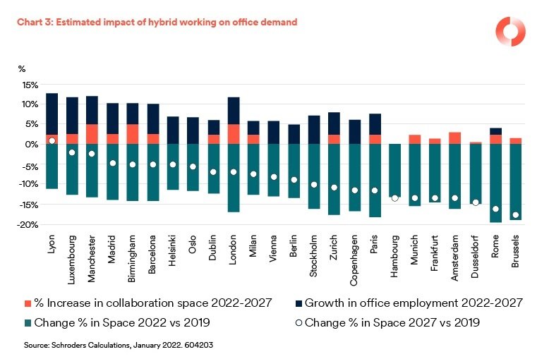 Op korte termijn zal de kantorenvraag in Europa als gevolg van het hybride werken - gedeeltelijk thuis en gedeeltelijk op kantoor - naar schatting circa 15% dalen ten opzichte van 2019.