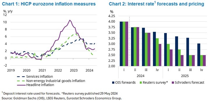 By contrast, Schroders' forecast is more optimistic, with three more cuts forecast this year, and two the next. This suggests some upside for both European fixed income markets (lower yields mean higher prices) and equity markets, which would be supported by higher economic growth, and lower discount rates.