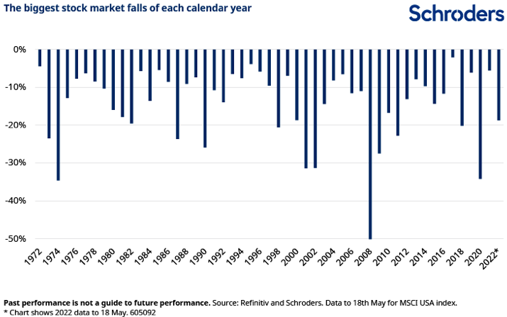 Eind mei waren de Amerikaanse aandelenmarkten zo’n 19% gedaald. Dalingen van meer dan 10% gebeurden de afgelopen 50 jaar 28 keer. Alleen al in het afgelopen decennium gebeurde het in 2012, 2015, 2016, 2018 en 2020. Een correctie van meer dan 20% kwam achtmaal voor. Ondanks deze regelmatige duikvluchten, bedroeg het gemiddelde rendement op de Amerikaanse markt over deze periode van 50 jaar 11% op jaarbasis. Het risico van verlies op korte termijn is de prijs voor de langetermijnwinsten die beleggen kan opleveren.