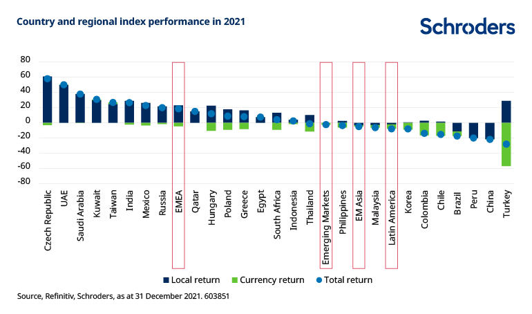 Global equities enjoyed a third consecutive year of robust returns in 2021, in what some commentators dubbed “the everything rally”. Everything except emerging market (and Japanese) equities, that is. With the MSCI World Index delivering a gain of almost 22% in US dollar terms, the MSCI Emerging Markets Index was down by over -2%.