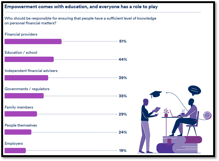 Significantly though, 44% believe that educational institutions have a role to play in educating people about financial matters, while a quarter (24%) view this as their personal responsibility.