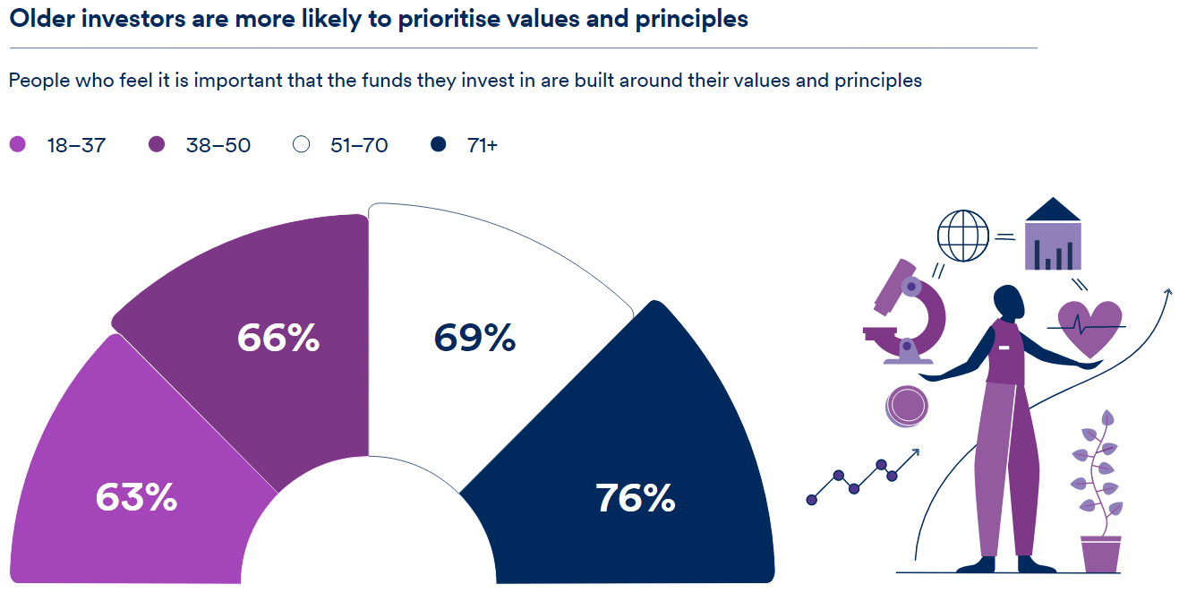 Furthermore, the importance given to values and principles by investors increases with age, with more than three-quarters (76%) of people aged 71+ more likely to prioritise these aspects, perhaps indicating that older investors are more confident and set in their views.