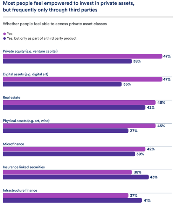 Furthermore, the Study indicates that people now feel more confident in accessing investments that might previously have been seen as off-limits. A particular example of this comes in private assets, with 47% of investors feeling empowered to access both private equity and digital assets.