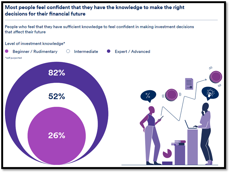 However, despite the positive intentions, a gap remains in terms of investors who feel genuinely empowered to make the right investment decisions for their future. Some 82% of ‘expert/advanced’ investors feel they have sufficient knowledge to feel confident in making investment decisions for their financial future, while only a quarter (26%) of ‘beginner/rudimentary’ investors’ feel knowledgeable enough to do so.