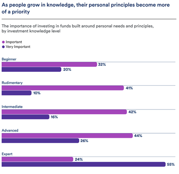 Our research shows that more than half of these ‘expert’ investors stated that their personal principles are ‘very important’ to them – significantly higher than those who class themselves as having an intermediate level of investment knowledge (16%) and those in the ‘rudimentary’ category (10%).