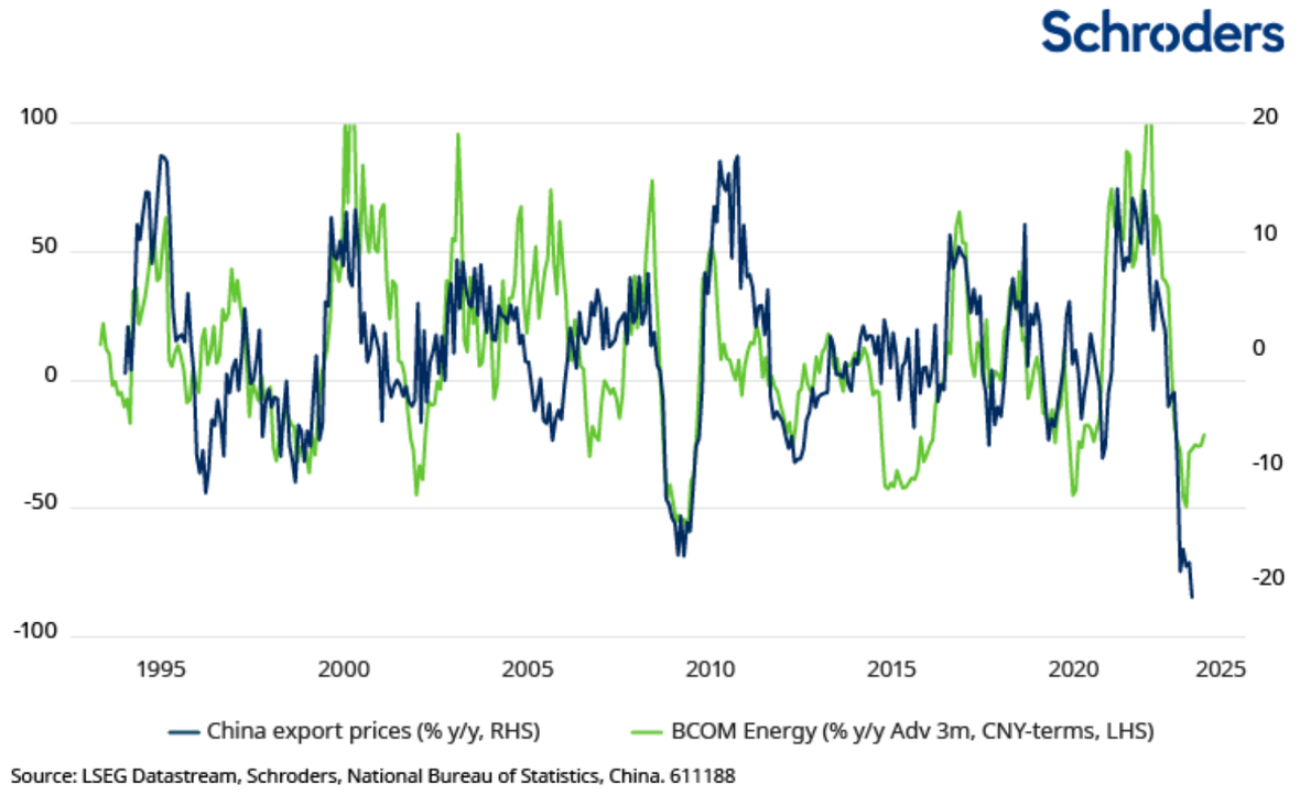 Hoewel China's export zich in de tweede helft van vorig jaar herstelde, zijn er tekenen dat bedrijven in sommige sectoren gedwongen zijn kortingen te geven om hun reservecapaciteit op te ruimen. De nominale exportgroei is bijvoorbeeld maar langzaam weer op gang gekomen, maar in termen van volume is de export snel gegroeid - volgens berekeningen van Schroders met 15-20% j-o-j in november.