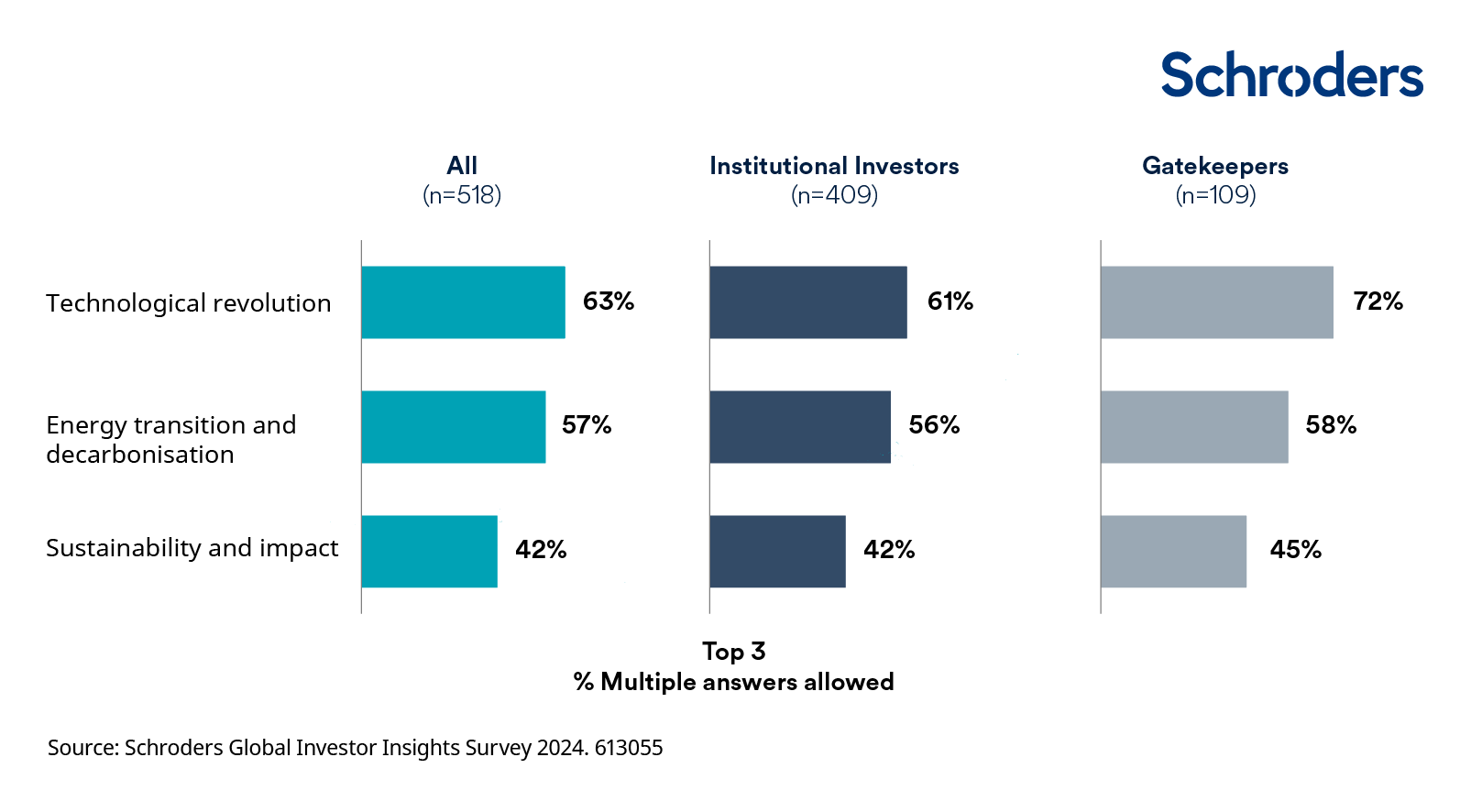 1 The Schroders Global Investor Insights Survey analyses the investment perspectives of global financial professionals on a range of topics across macro themes, sustainability and public and private markets. The 2,830 respondents represent a spectrum of institutions, including pension funds, insurance companies, family offices endowments and foundations, official institutions, gatekeepers and wealth and financial advisers. The respondent universe is collectively responsible for US$74.5 trillion in assets.