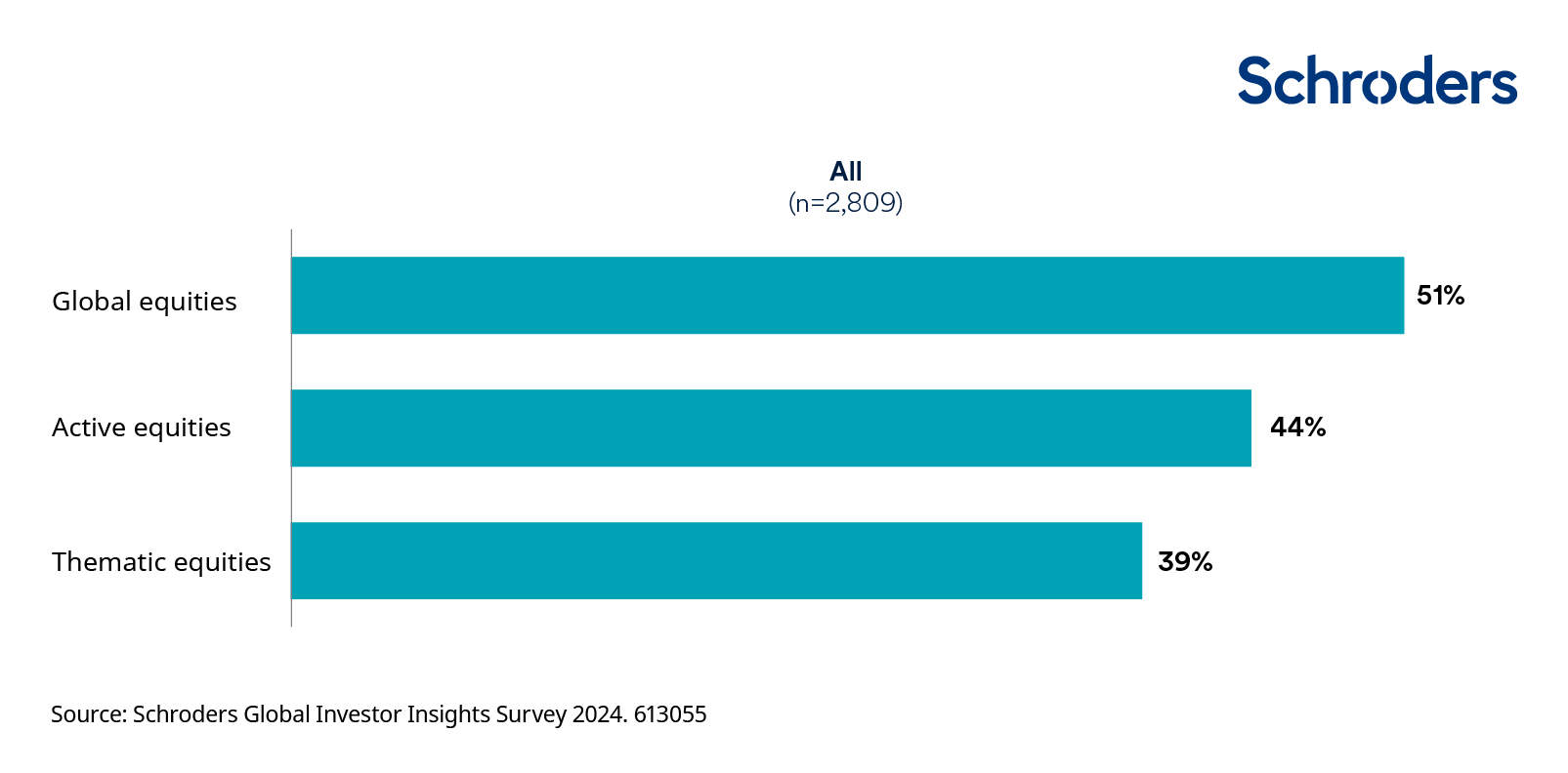On the other hand, more than half (51%) of investors are expecting to increase their allocations to global equities over the coming two years. Interestingly, almost half of all investors (44%) were looking to increase their allocations to active equities (44%) and demand for thematic equities (39%) was also high. Some 30% of institutional investors and gatekeepers said they are looking to increase their exposure to the energy transition as an investment theme.