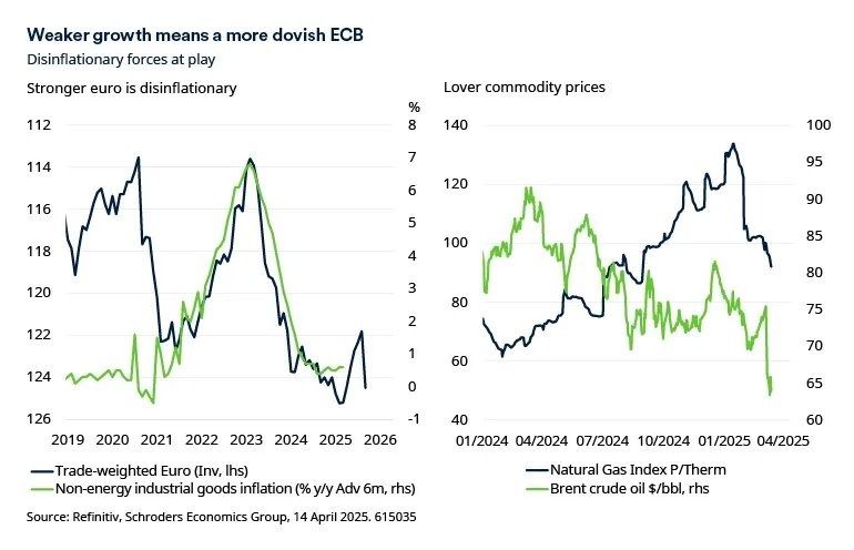Nu op China’s export naar de VS invoerrechten betaald moeten worden, bestaat de kans dat die stroom zich naar Europa verlegt. Europa loopt volgens mij nu dus het risico dat de groei vertraagt, terwijl er tegelijk desinflatoire krachten aan het werk zijn. Dat zal de roep om de rente te verlagen kracht bijzetten. Er komt wel een positieve impuls vanuit het begrotingsbeleid, met name in Duitsland, maar het effect daarvan op de bedrijvigheid wordt wellicht pas volgend jaar merkbaar.
