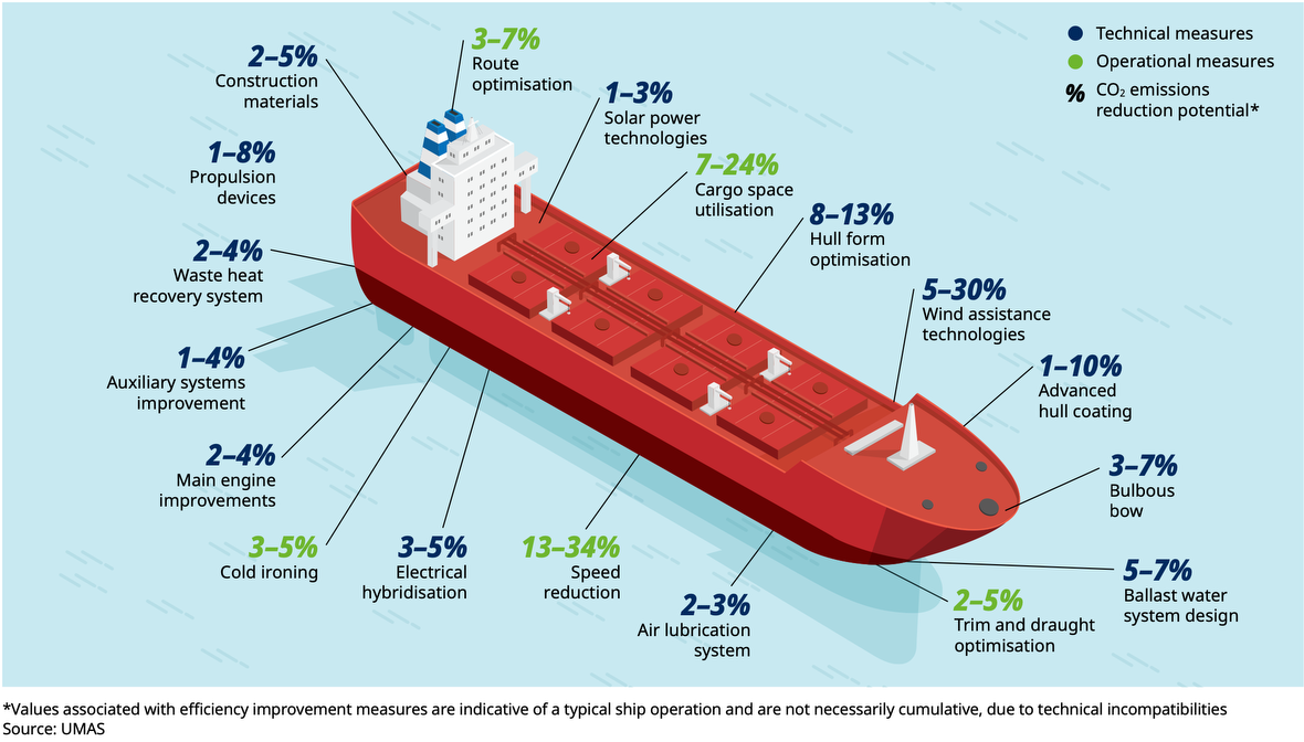 - Les investissements visant à améliorer les navires eux-mêmes (efficacité énergétique et moteurs), qui représentent 13 % du total des investissements nécessaires.