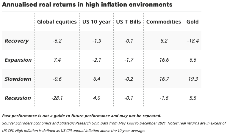 The risk of stagflation favours inflation-hedges such as commodities and gold.