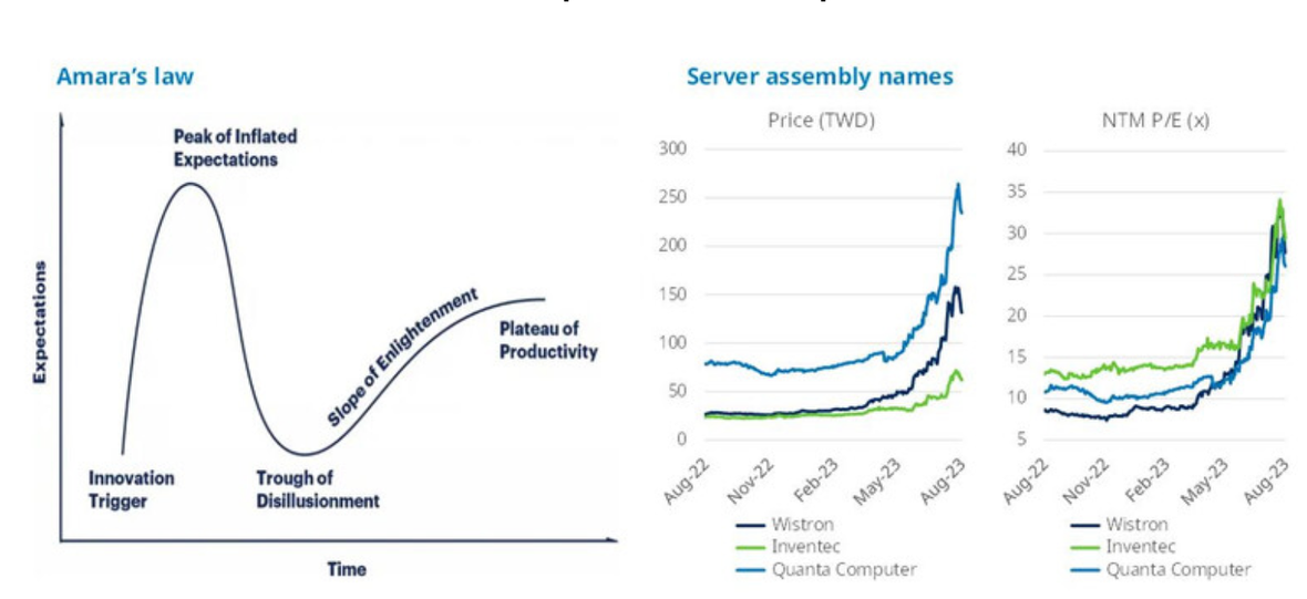 Pour M. Parbrook, il ne fait aucun doute que l’IA est une technologie potentiellement révolutionnaire, mais qui n’en est qu’à ses débuts et dont les applications doivent encore trouver leur forme. Le scientifique et futurologue Roy Amara affirme que « nous surestimons souvent l’impact d’une technologie à court terme et le sous-estimons à long terme ». C’est ce que l’on appelle la loi d’Amara. M. Parbrook estime que, dans cette optique, nous sommes actuellement proches du point culminant des attentes exagérées en ce qui concerne les « actions IA » à Taïwan.