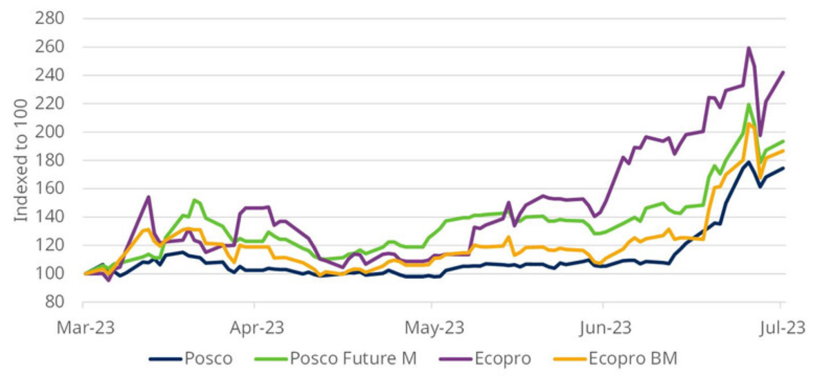 Toutes ces mesures sont fondées sur les réglementations américaines prévues par la loi sur la réduction de l’inflation (Inflation Reduction Act), qui visent à encourager les investissements nationaux dans le secteur et à empêcher les stocks de batteries chinoises d’entrer sur le marché américain. Il s’en est suivi une frénésie d’achat de la part des investisseurs privés coréens dans ce secteur, encouragés par un conseiller en ligne douteux qui se fait appeler « Mister Batt-Man » – ou « Mr Battery » – et qui jouit d’une grande popularité auprès des investisseurs particuliers. Cet enthousiasme a entraîné des mouvements assez extraordinaires dans des actions spécifiques en Corée, avec des noms thématiques tels que Ecopro, Posco Future M, Ecopro BM et Posco (bien qu’il s’agisse à 80 % d’une entreprise sidérurgique) qui ont doublé depuis la fin du mois de mars et ont augmenté de 60 à 70 % au cours du seul mois de juillet.