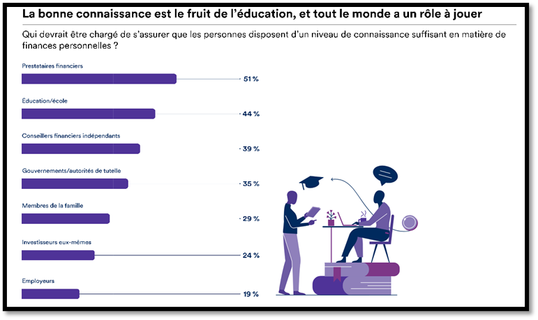 Cela souligne la nécessité d’une meilleure éducation financière et le rôle que les fournisseurs de services financiers doivent jouer. Plus de la moitié (51 %) estiment que les sociétés d’investissement doivent veiller à s’assurer que les personnes ont suffisamment de connaissances en matière financière personnelle, et 39 % pensent que cela doit incomber aux conseillers financiers.