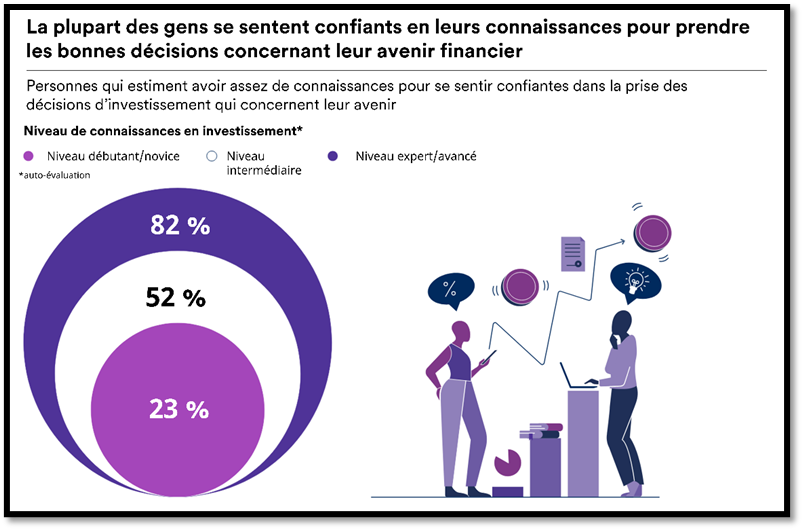 Toutefois, malgré les intentions positives, il subsiste un fossé en termes d’investisseurs qui se sentent véritablement habilités à prendre les bonnes décisions d’investissement pour leur avenir. Près de 82 % des investisseurs « experts / avancés » estiment disposer de connaissances suffisantes pour prendre des décisions d’investissement pour leur avenir financier, tandis que seulement un quart (26 %) des investisseurs « débutants/rudimentaires » se sentent suffisamment informés pour le faire.