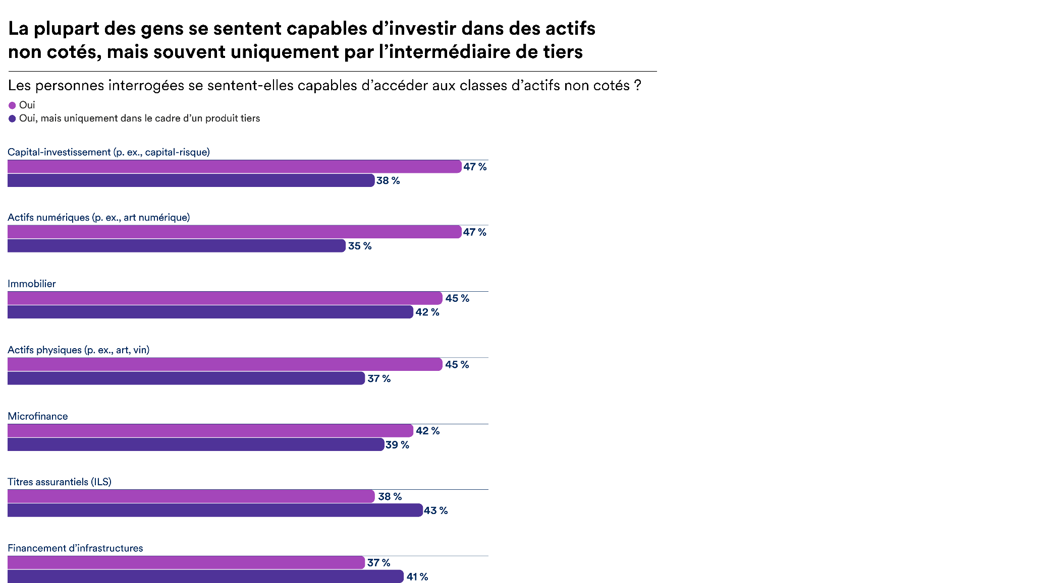 En outre, l’étude montre que les investisseurs se sentent désormais plus confiants dans l’accès à des investissements qui auraient pu être considérés comme hors limites. C’est notamment le cas des actifs privés, 47 % des investisseurs se sentant en mesure d’accéder au capital-investissement et aux actifs numériques.