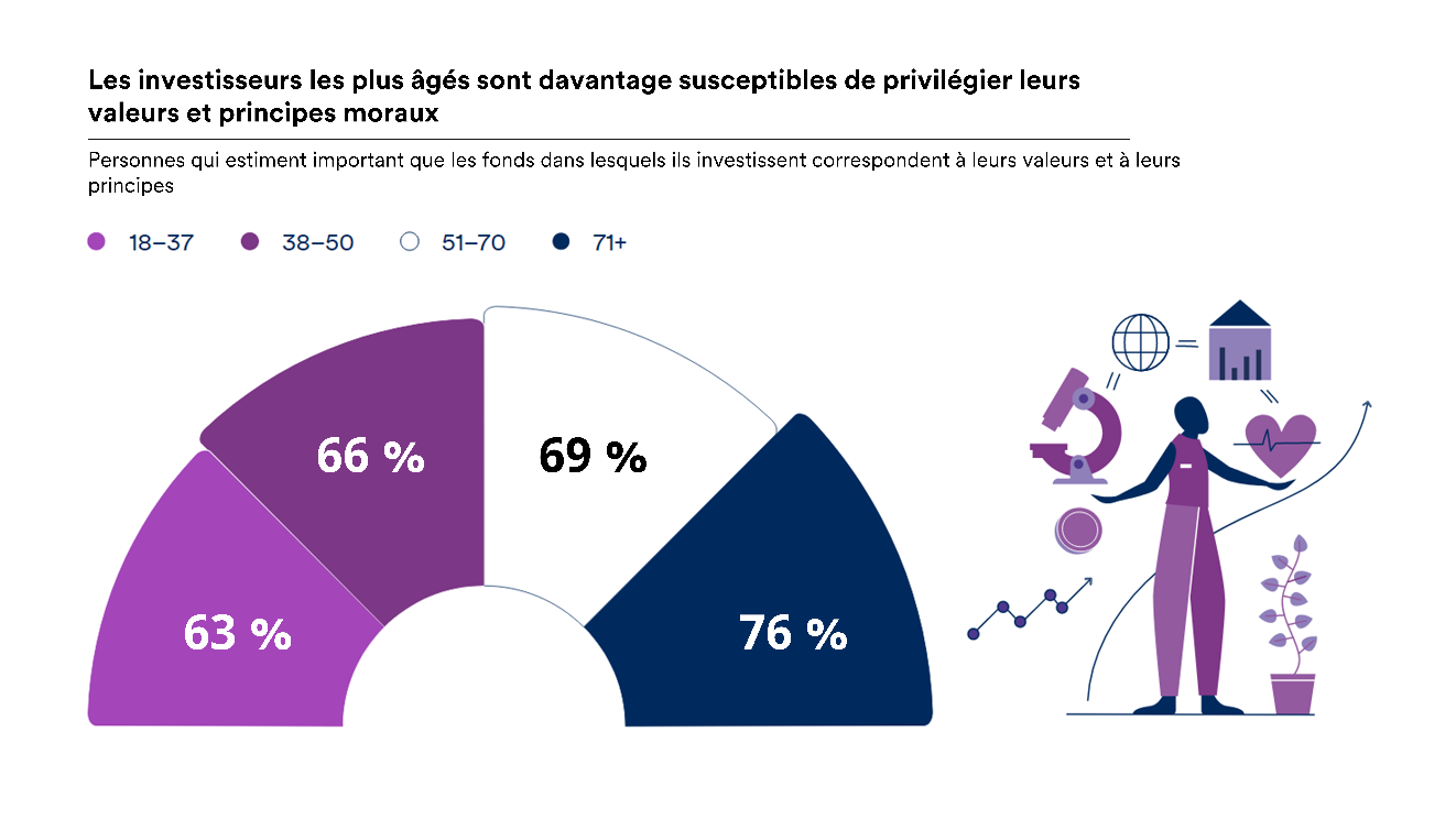 En outre, l’importance accordée aux valeurs et aux principes par les investisseurs augmente avec l’âge, plus des trois quarts (76 %) des personnes âgées de 71 ans et plus étant susceptibles de privilégier ces aspects, ce qui indique peut-être que les investisseurs plus âgés sont plus confiants et fermes dans leurs opinions.