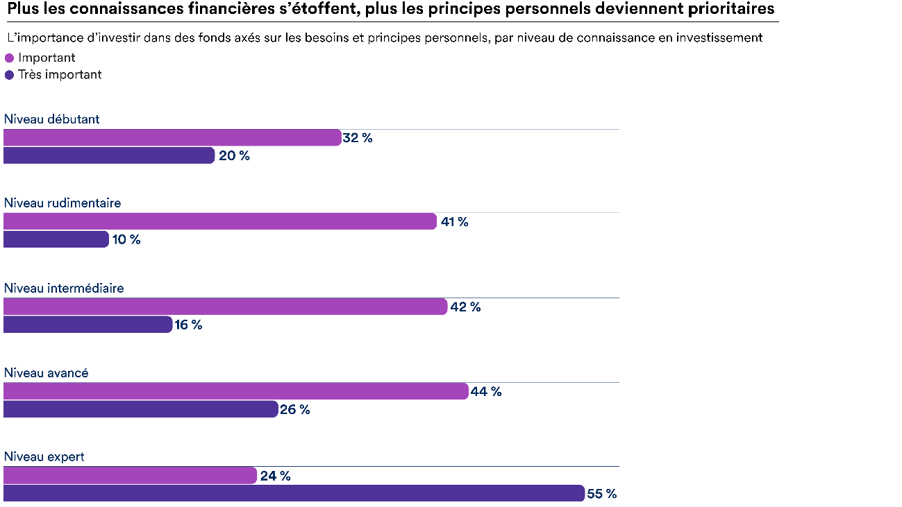 Nos recherches montrent que plus de la moitié de ces investisseurs « experts » ont déclaré que leurs principes personnels sont « très importants » pour eux, nettement plus élevés que ceux qui se considèrent comme ayant un niveau intermédiaire de connaissances en investissement (16 %) et ceux de la catégorie « niveau rudimentaire » (10 %).