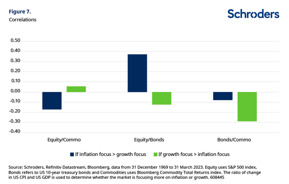 Schroders pense que les matières premières offrent une meilleure diversification que les obligations en période d’inflation élevée. C’est un point important - les matières premières sont tombées en disgrâce dans les portefeuilles multi-actifs parce que l’inflation n’a plus posé problème depuis plus de 15 ans. Si les investisseurs se rendent compte qu’ils se trouvent dans une nouvelle ère où l’inflation constitue à tout le moins une menace pour le rendement des investissements, les 15 dernières années précédentes d’inflation basse persistante peuvent être considérées comme une anomalie et une allocation structurelle en matières premières retrouve son utilité.