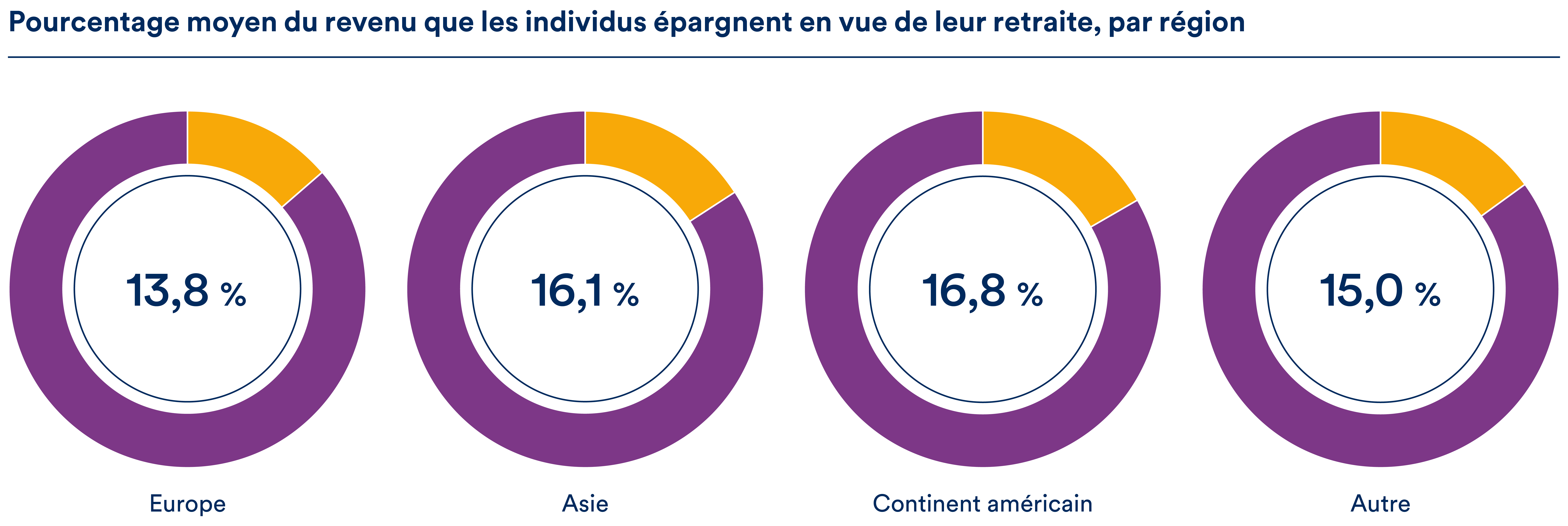 Sur une note positive, l’épargne-retraite constituée par les investisseurs à partir de leurs revenus reste stable à 15,2 %. 55 % des personnes interrogées dans le monde s’accordent à dire que les seules dispositions de l’État ne suffiront pas à leur assurer une retraite viable. Plus précisément, les investisseurs américains sont les premiers à épargner à 16,8 %, contre 13,8 % en Europe.