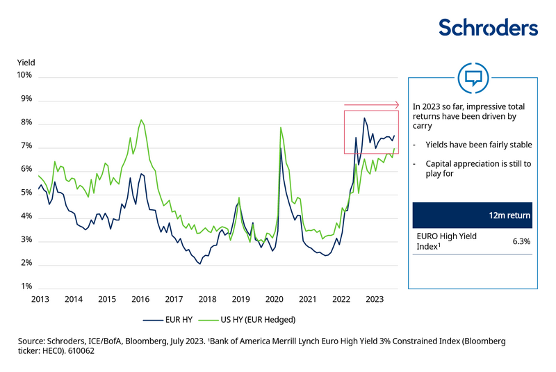Over the past 12 months there hasn’t been yield compression in the European HY bond market and yet total returns have been strong. This is because around 70% of the returns have been from carry. The asset class has a yield-to-worst of 7.5% today, which is actually 0.2% higher than this time last year.