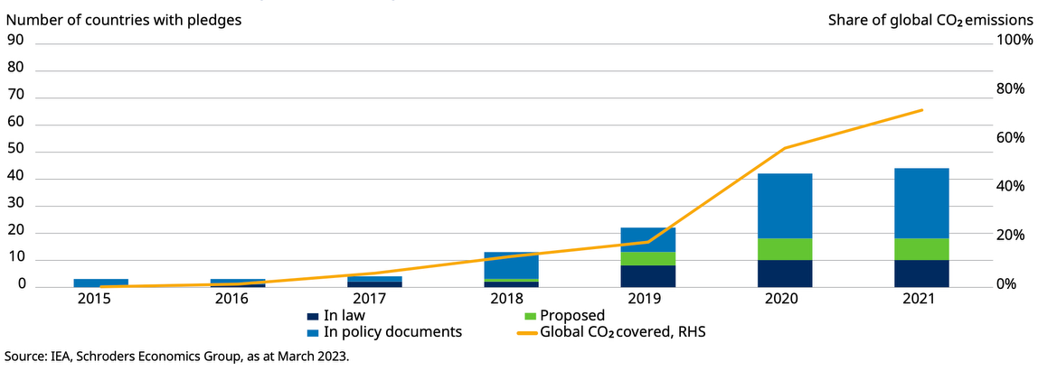 De nombreux pays prennent davantage d’actions dans le domaine du changement climatique. Ces trois dernières années, les États-Unis ont à nouveau adhéré à l’Accord de Paris et la Chine s’est engagée à atteindre l’objectif zéro net d’ici 2060. La réponse au changement climatique s’accélérera avec la prise de conscience des gouvernements face aux risques croissants de dommages physiques causés par le changement climatique non contrôlé. Avec le durcissement de la réglementation, les régimes de subventions vertes et la tarification du CO2, il semble que les décideurs politiques des grandes économies occidentales s’accordent de plus en plus à vouloir encourager un certain comportement visant à forcer le changement.