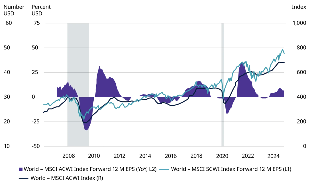 Les dépêches d’information quotidiennes créent parfois de la volatilité à court terme, mais à long terme, les bénéfices et d'autres fondamentaux de l'entreprise sont le moteur des cours des actions. En se penchant sur les vingt dernières années, on remarque à quel point le marché mondial des actions (mesuré par exemple à l’aide de l’indice MSCI All Country World) suit les prévisions bénéficiaires des entreprises.