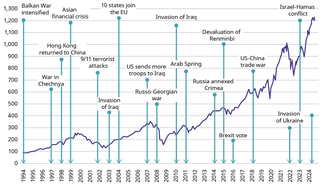 Lors d'événements qui secouent les marchés, il est tentant de rester sur la touche ou de se fier principalement au marché domestique. Néanmoins, ces trente dernières années ont montré que les actions mondiales se sont souvent montrées relativement résilientes, même lors de grands défis géopolitiques. Bien que des fluctuations puissent toujours se produire, elles ont généralement un caractère temporaire, tandis que la tendance générale à plus long terme reste haussière.