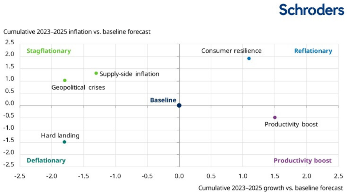 Premièrement, la demande est aujourd’hui beaucoup plus faible. Alors que d’importantes mesures de relance monétaire et budgétaire ont alimenté l’économie mondiale après les perturbations initiales causées par la pandémie mondiale, la croissance ralentit désormais. Schroders prévoit une croissance du PIB mondial de seulement 2,5 % cette année et l’année prochaine. La zone euro est probablement déjà en récession, le Royaume-Uni est faible et l’activité américaine se refroidit.