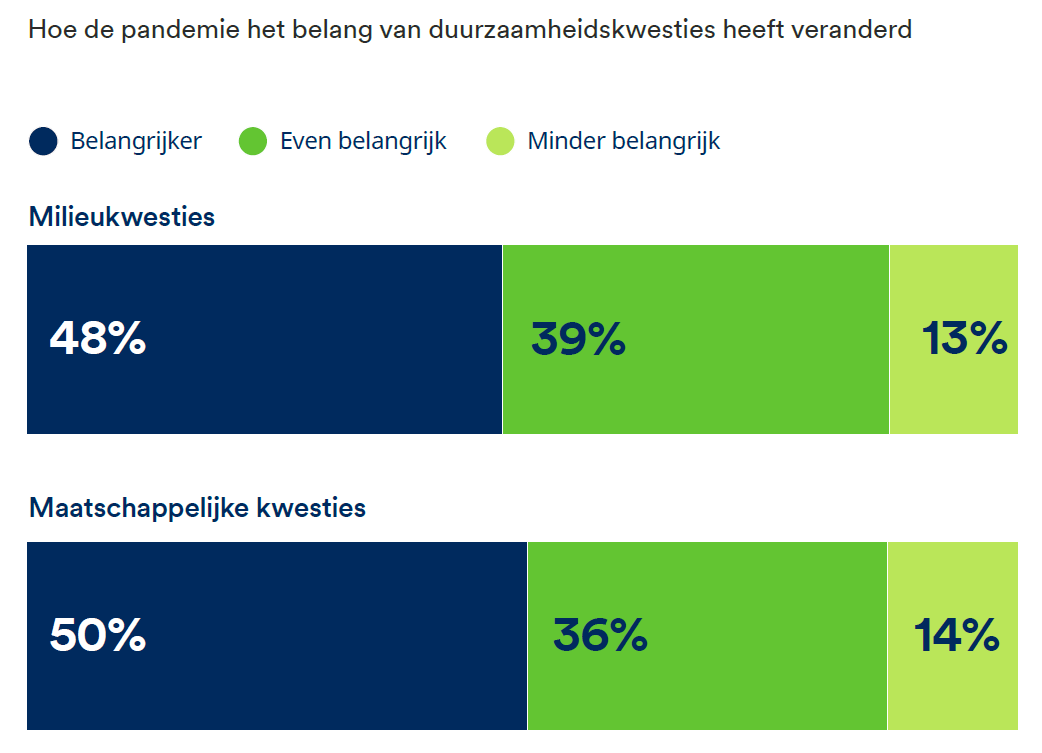 Hoe beïnvloedt dit toegenomen bewustzijn het gedrag en de houding ten opzichte van duurzaam beleggen in België? Uit de Global Investor Study 2021 blijkt dat respectievelijk 50% en 48% van de Belgen sociale vraagstukken en milieuproblemen nu belangrijker/veel belangrijker vindt dan vóór de pandemie. 36% zegt maatschappelijke vraagstukken nu even belangrijk te vinden als vóór de pandemie, terwijl 39% milieukwesties even belangrijk vindt.