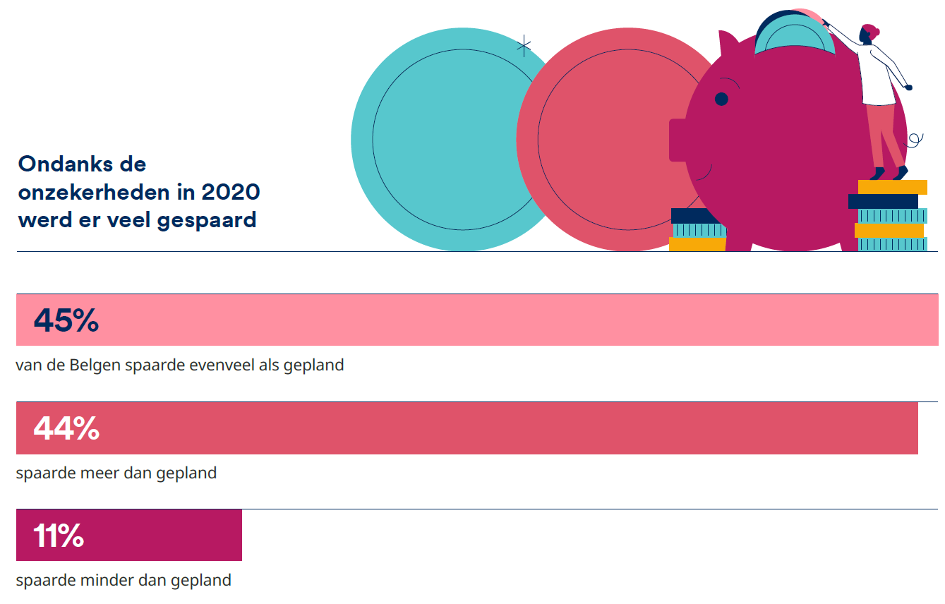 Hoewel 2020 een veelbewogen jaar was, werd er veel gespaard. Bijna de helft (45%) van de Belgische beleggers spaarde evenveel als ze gepland hadden, en bijna hetzelfde aantal (44%) spaarde meer dan gepland. Dit kwam, zoals te verwachten, vooral doordat ze minder uitgaven aan niet-essentiële zaken zoals restaurantbezoek, reizen en amusement. Van de Belgische beleggers die hun spaardoel niet hadden gehaald (11%), noemde 38% minder salaris/inkomen uit werk als de voornaamste reden, wat in belangrijke mate een gevolg van de pandemie was.