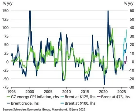 Sinds de Israëlische aanval op Iran op 13 juni is de Brent-olieprijs met 10% gestegen. Als de prijs op dit niveau blijft, betekent dit dat de energie-inflatie in de G7-landen in het komende jaar iets boven de 5% zal liggen (zie grafiek hieronder). Dit zal waarschijnlijk geen brede inflatiedruk veroorzaken.