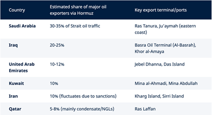 Er is veel gespeculeerd over het afsluiten van de Straat van Hormuz door Iran als een vergeldingsmaatregel. Deze zeestraat is essentieel voor het wereldwijde olietransport. Toch is de Straat in werkelijkheid een relatief brede internationale vaarroute en is het praktisch gezien niet mogelijk om deze volledig af te sluiten. Belangrijker nog: hoewel het aanvallen van scheepvaart theoretisch een risico vormt, komt het grootste deel van de olie die door de Straat wordt vervoerd uit buurlanden van Iran (zie tabel hieronder). Een daadwerkelijke verstoring van de doorgang zou agressieve acties tegen internationale scheepvaart vereisen, met als gevolg verdere isolatie van Iran en het risico op een bredere escalatie — onder meer door schending van het internationaal zeerecht, wat ook andere landen bij het conflict zou kunnen betrekken.