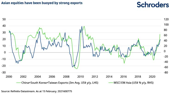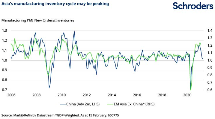 Schroders estime que le relais sera pris par d’autres pays émergents au fur et à mesure que les stocks se rempliront et que l’économie mondiale se redressera, ce qui fera glisser la demande des biens de production vers les services. Cela peut entraîner un retournement de la surperformance récente des marchés émergents asiatiques. Schroders y voit trois raisons :