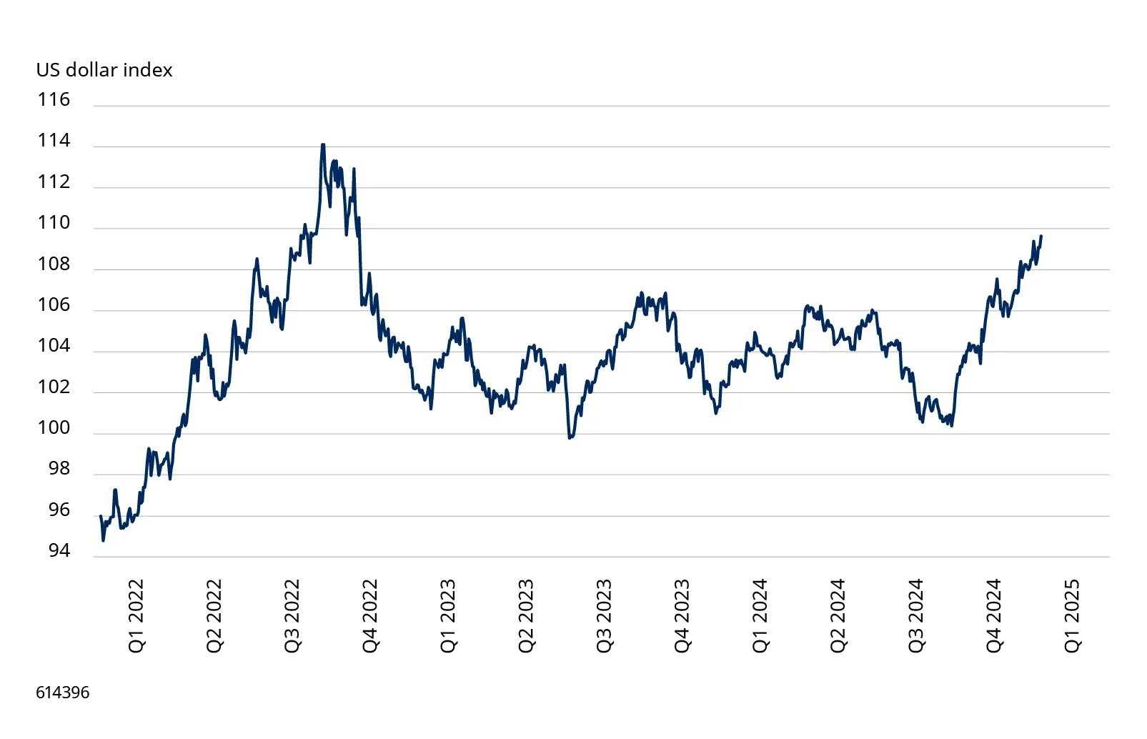 Multiple factors combined to send the US dollar higher at the end of 2024. These factors included expectations of higher interest rates in the US relative to other major central banks, as well as higher US growth compared to other regions.