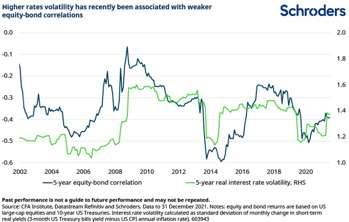 Certains facteurs qui soutiennent la corrélation négative entre actions et obligations perdent en intensité. Plus précisément, l'inflation a augmenté et les perspectives comportent beaucoup d'incertitude. Cela pourrait entraîner une volatilité accrue des taux si les banques centrales suppriment leurs mesures de relance pour refroidir l'économie.