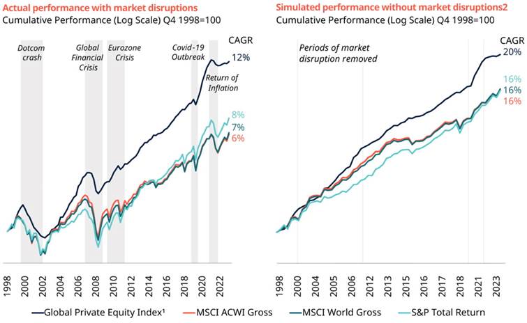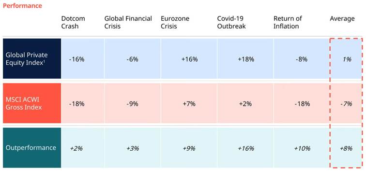 Gezien deze tegenwind is het belang van private equity als hulpmiddel voor beleggers om mondiale onzekerheid het hoofd te bieden wellicht nog nooit zo groot geweest. Historisch gezien heeft deze beleggingscategorie immers vaak bescherming geboden tegen volatiliteit op de publieke markten en juist goed gepresteerd tijdens neerwaartse marktcycli.
