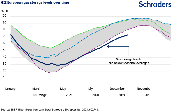 Europa staat aan de vooravond van de winter en ondertussen schieten de energieprijzen door het dak. Het onderstreept de noodzaak om meer te investeren in technologie voor de energietransitie, schrijft Mark Lacey, hoofd commodities bij Schroders. Europa bevindt zich in het centrum van de storm, veroorzaakt door de hoge energieprijzen.